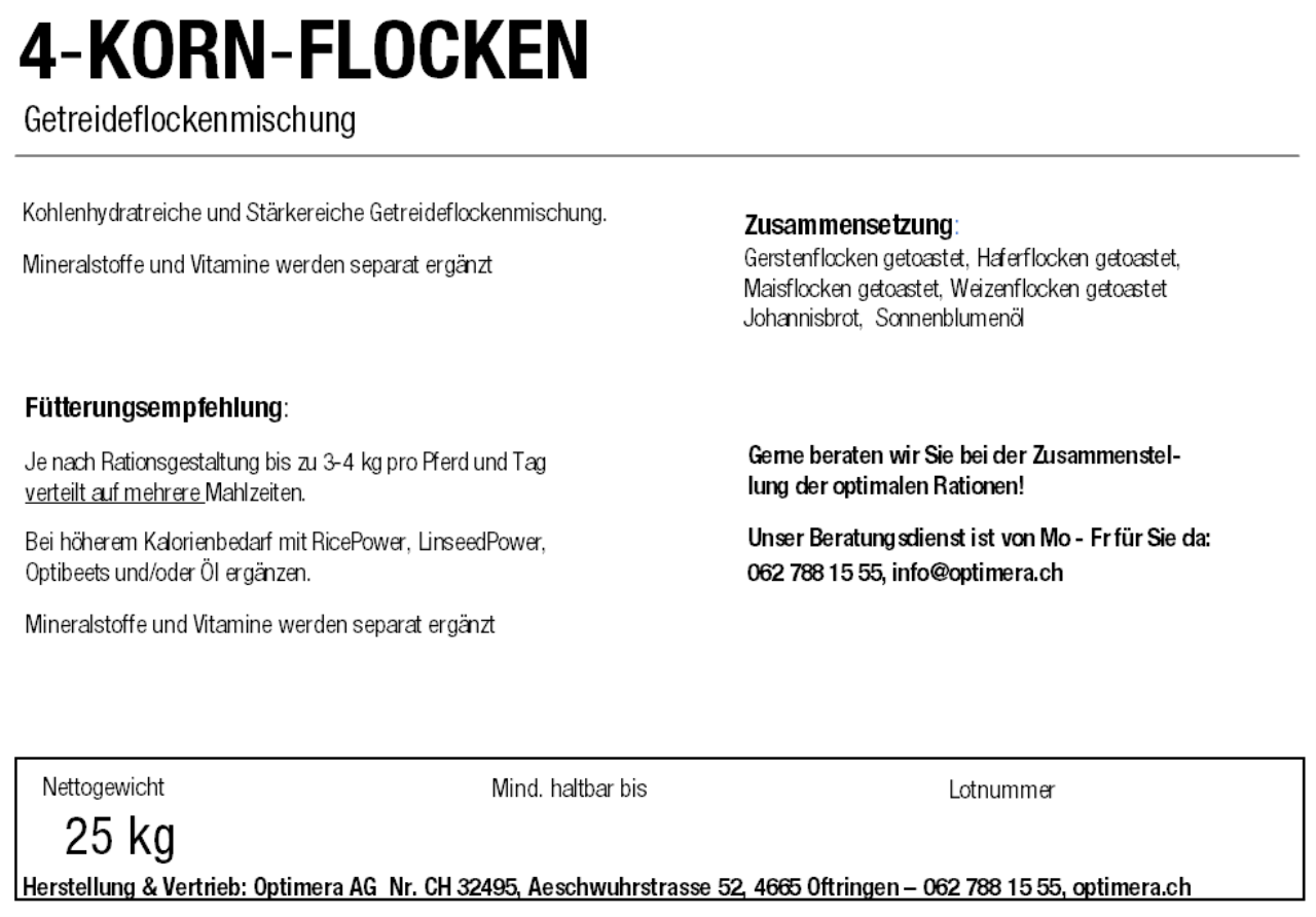 4-Kornflocken Premium ist eine ausgewogene Getreidemischung, dampfgewalzt, aus ganzem Hafer, Gerste, Weizen und Mais. Durch den Stärkeaufschluss ist diese Mischung leicht verdaulich und energiereich.