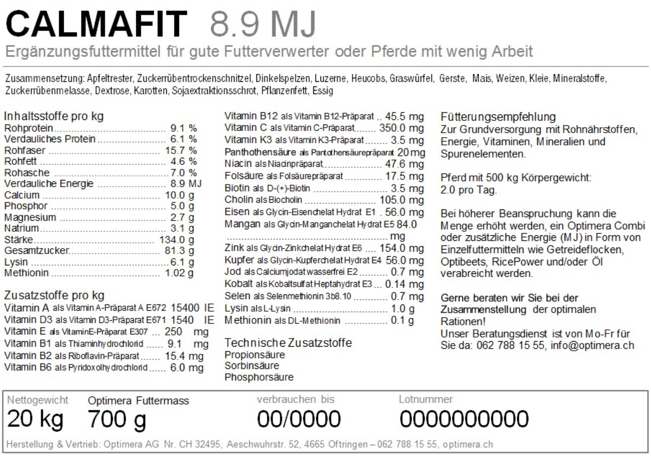 Calmafit ist unser Rohfaser-reiches und gut strukturiertes Mischfutter für gute Futterverwerter oder Pferde mit wenig Arbeit (Stehfutter). Calmafit zeichnet sich weiter durch einen bewusst tief gehaltenen Energiegehalt aus. Da zugesetzt, sind essentielle Aminosäuren trotz dem tiefen Rohproteingehalt des Futter vorhanden.