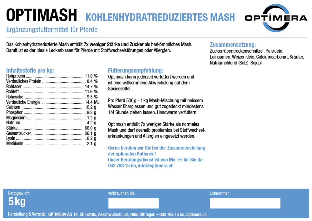 Optimash enthält 6x weniger Stärke als normales Mash und darf deshalb problemlos bei Stoffwechselerkrankungen und Allergien eingesetzt werden.