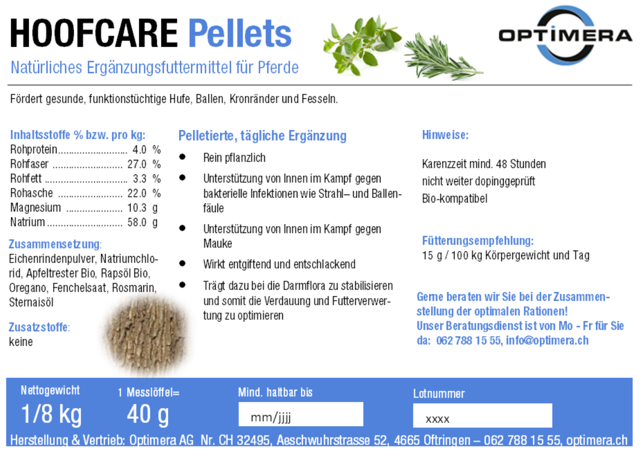 Hoofcare Pellets sind ein rein natürliches, konzentriertes Ergänzungsfuttermittel, welches eine entzündungswidrige und verdauungsfördernde Wirkung hat. Die Wirkungskraft der Eichenrinde, kombiniert mit entzündungswidrigen Pflanzen wie Origanum und Rosmarin fördern den gesunden Stoffwechsel, bekämpfen Entzündungen und stärken die Organe, besonders den Darm und die Leber.