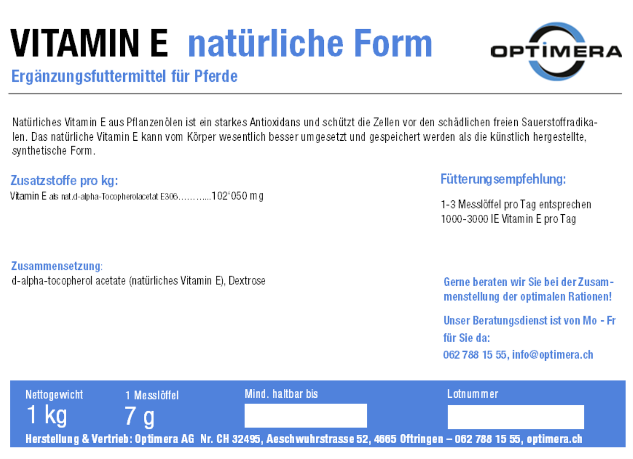 Wenn vorhanden, wird natürliches Vitamin E im Normalfall auf den Etiketten ausgewiesen. Wenn einfach Vitamin E Präparat oder dl-alpha-tocopherol steht, ist es sicher künstlicher Herkunft.Bei muskulären Problemen (Kreuzschlag, Tying up, PSSM)
