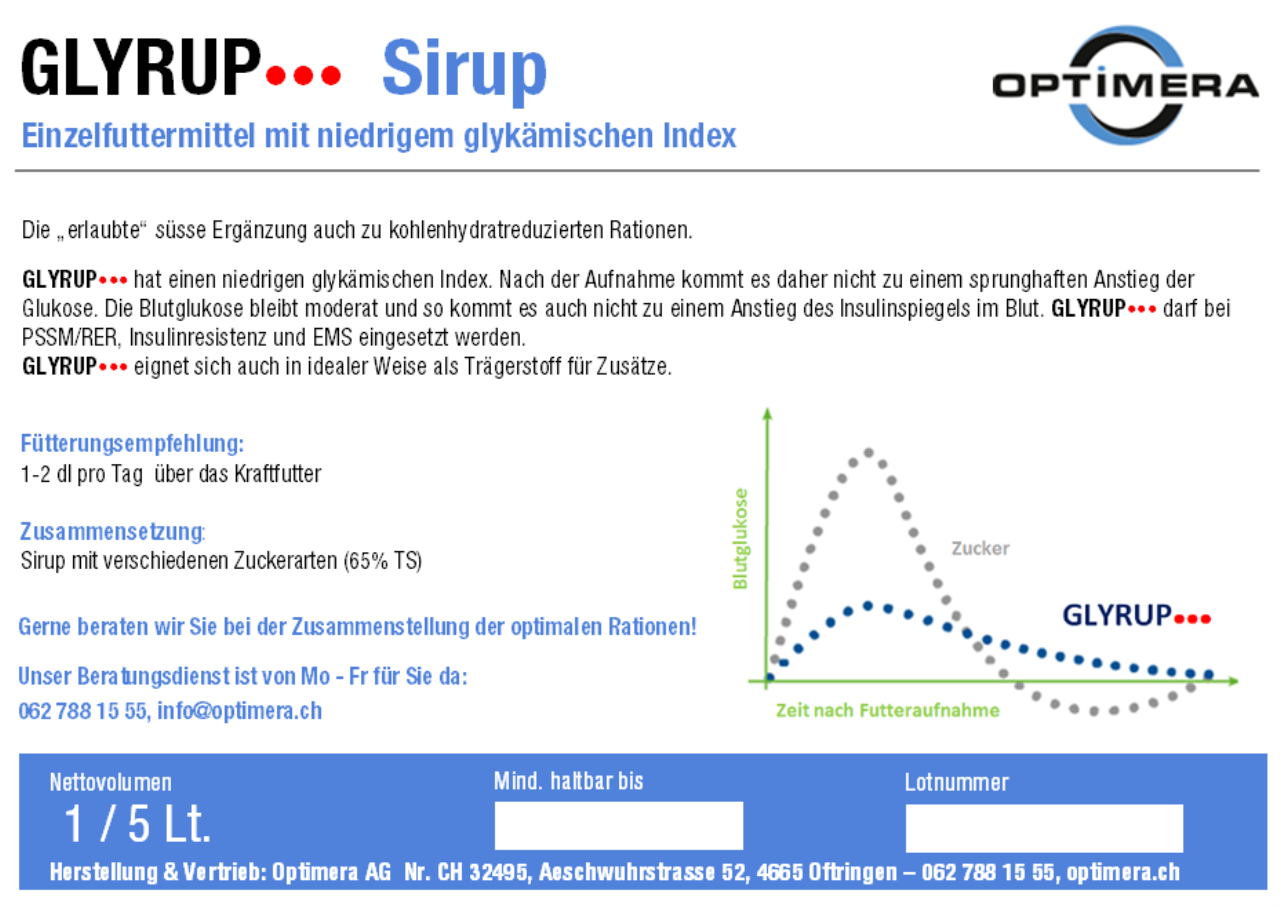 1 – 2 dl GLYRUP••• pro Tag unter das Kraftfutter mischen. Auf die 2-3 Mahlzeiten verteilen