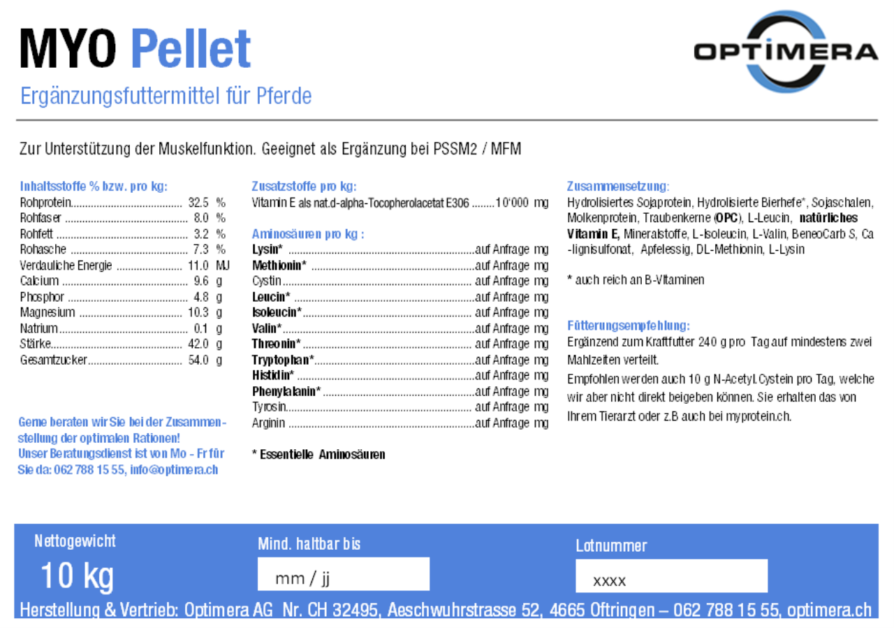 Ebenso wichtiger Bestandteil von MYO Pellets sind starke Antioxidatien. So das bewährte natürliche Vitamin E und das OPC aus Traubenkernen. Gemäss den neusten Publikationen aus den USA wird zudem Coenzym Q10 empfohlen. Auch empfohlen wird die Gabe von 10 g N-Acetyl-L-Cystein* pro Tag. Gemäss der Futtermittelgesetzgebung dürfen wir das aber nicht in unser Produkt einmischen. Coenzym Q10 bieten wir Ihnen dagegen als flüssige Ergänzung an.