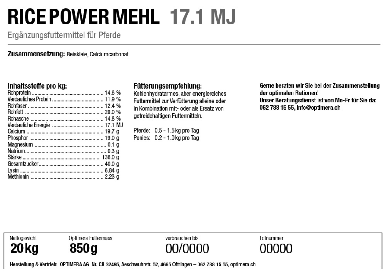 Das RicePower Mehl ist reine italienische Reiskleie ergänzt mit Calcium. Mit rund 20% Fett enthält dieses Futter 1.5x mehr verdauliche Energie als Getreide. Bei der Verstoffwechselung von Fett wird weniger Milchsäure produziert. Die Muskulatur wird weniger belastet und erholt sich schneller.