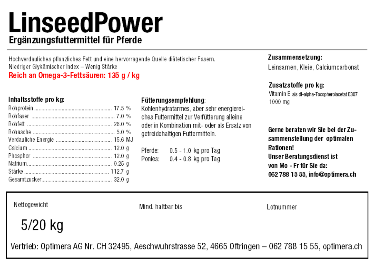 Comme RicePower, LinseedPower est un extrudât très savoureux. L’ingrédient principal est la graine de lin, qui à 135 g/kg fournit une très forte proportion d’acides gras polyinsaturés de type oméga-3. LinseedPower contient également le son précieux, supplément du calcium pour équilibrer le ratio Ca : P et la vitamine E comme antioxydant puissant.