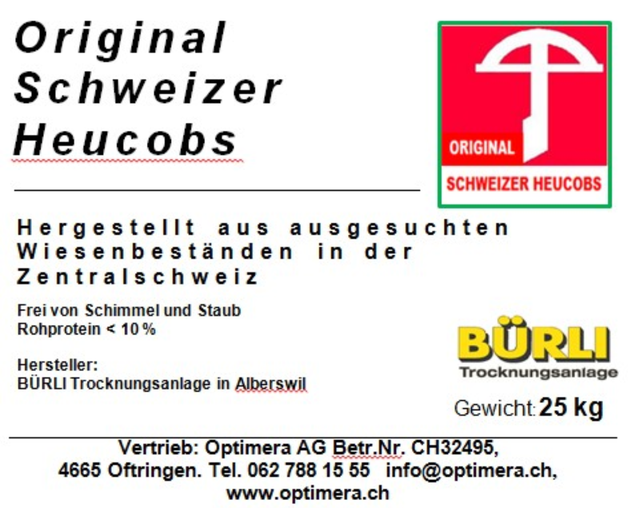 Les cobs de foin d’origine Suisse, ne contiennent pas de Mélasse et autres additifs. Après la récolte, ils sont transformés par un processus de séchage spécial et emballés aussitôt. Ainsi ils conservent grand nombre des ingrédients d’origine.