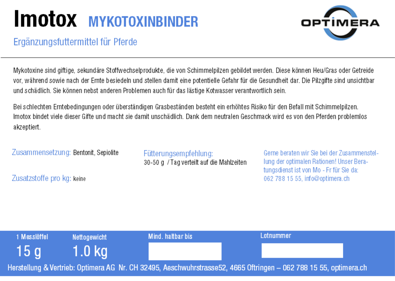 Dans des conditions de récolte médiocres ou des stocks d’herbe surpeuplés, il existe un risque accru d’infestation par des moisissures. Imotox lie plusieurs de ces poisons, les rendant inoffensifs. Grâce au goût neutre, il est facilement accepté par les chevaux.