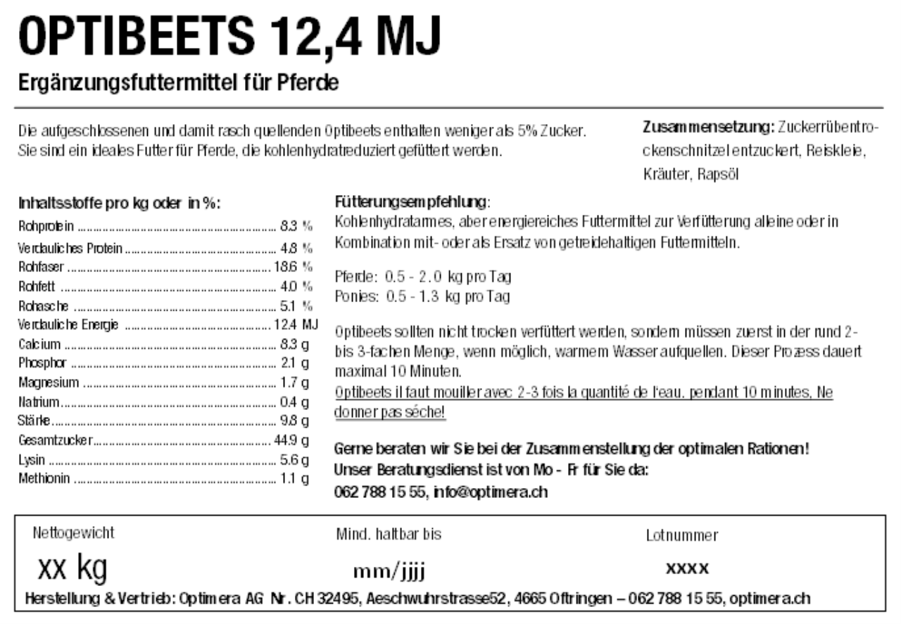 Cette forme d’énergie tranquille, à partir de fibres brutes, hautement digestibles, ne rend pas le cheval hyperactif. Optibeets peut être administré à tous les chevaux. Etant donné, qu’Optibeets ne contient pas de glucides, comme on peut les trouver dans des flocons de céréales, cet aliment peut être administré aux chevaux présentant le Syndrome de Cushing, de la fourbure, Tying up, etc.