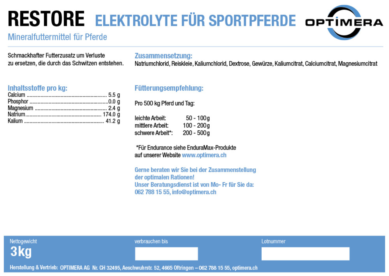 Les dépôts d’électrolytes doivent être suffisamment remplis, avant une compétition. Cependant, il n’est pas possible de faire une grande réserve. Par conséquent, après un grand effort et une perte de sueur importante, ceux-ci devraient être remplacés. Restore Powder est savoureux et est également bien accepté, par les chevaux qui aiment faire la « moue ».