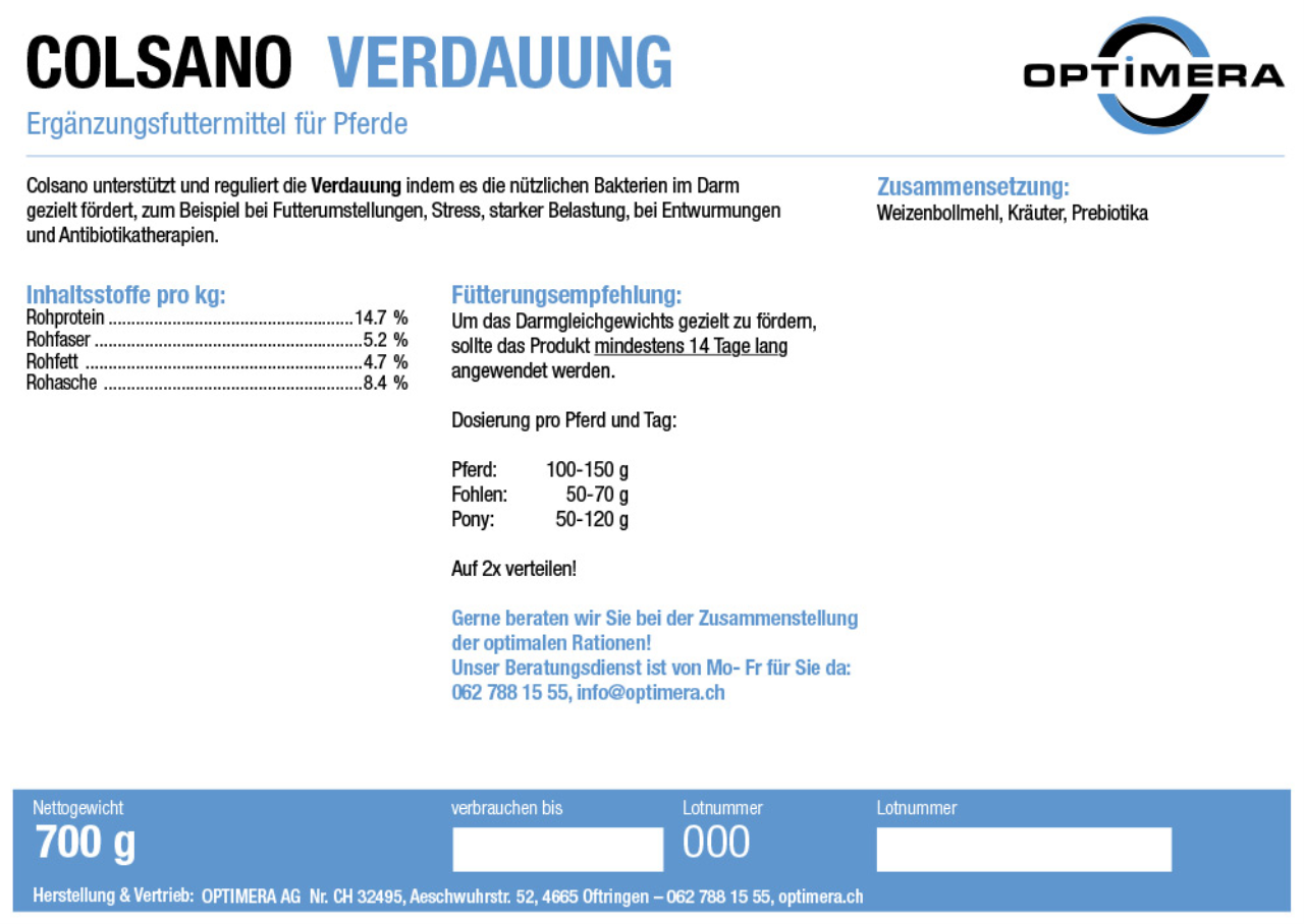 Colsan soutient et régule la digestion, en favorisant de façon ciblée, la formation de bactéries utiles, e. g. lors d’un changement d’aliment, stress, travail intensif, vermifugation et lors d’un traitement à base d’antibiotiques. Afin de favoriser de façon ciblé l’équilibre intestinal, le produit doit être administré au moins pendant une durée de 14 jours.