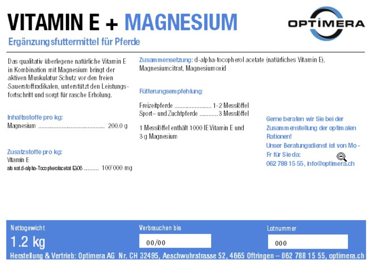 Le magnésium et la vitamine E jouent un rôle important pour la musculature et le sytème nerveux. Les chevaux, ayant des problèmes musculaires comme Tying up/PSSM/SER, ceux, qui font de grands efforts (sport, élevage) mais aussi ceux, qui n’absorbent que peu d’herbe fraîche, ont un besoin plus élevé en vitamine E. De l’herbe fraîche est la meilleure source en vitamine E. Dans le foin, la teneur tombe de 70%, déjà une semaine après la coupe. Les céréales contiennent de façon générale peu de vitamine E. Nous utilisons dans tous nos produits, exclusivement de la vitamine E naturelle (d-alpha-tocophérol). La vitamine E synthétique E (dl-alpha-tocophérol), beaucoup moins chère, est à base de pétrole et n’est pas très bien absorbé par le cheval. La vitamine E naturelle (d-alpha-tocophérol) par contre, est à base de plantes et est 2-3 fois plus disponible pour le cheval, que la vitamine E synthétique. Si disponible, la vitamine E naturelle est normalement indiquée sur l’étiquette. Si uniquement une préparation de vitamine E ou dl-alpha tocophérol est indiquée sur l’étiquette, il est certainement d’origine synthétique. Le magnésium est souvent appelé le „sel du calme intérieur“. S’il y a des carences, le comportement devient agité. Le magnésium apporte en peu de temps, un effet apaisant sur le système nerveux. Il atténue la transmission de l’agitation hypernerveuse, due au stress. Il aide à lutter contre l’agitation et tourmente et rend les nerfs en câbles métalliques. Notre magnésium est un mélange d’oxyde de magnésium et le citrate de magnésium.